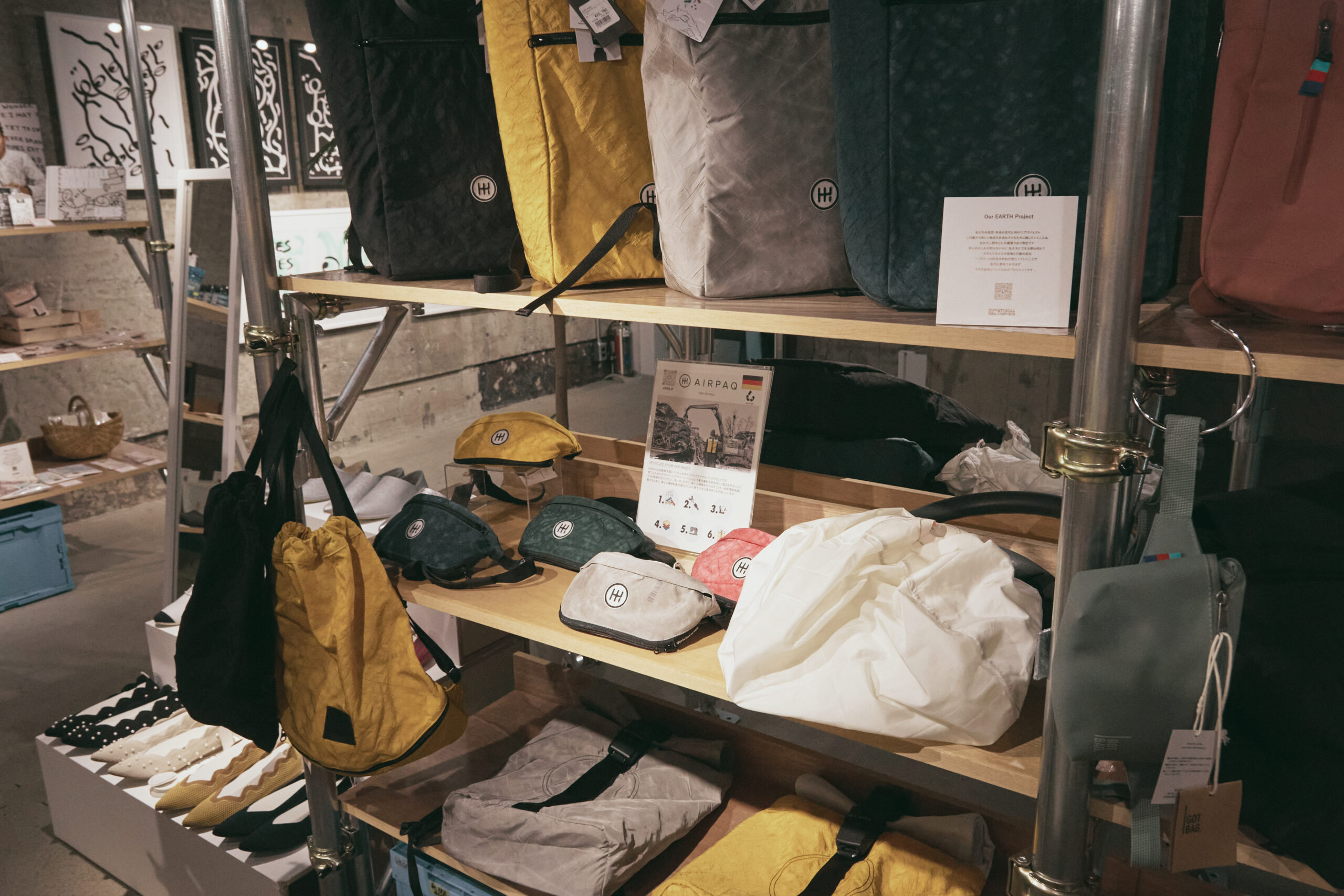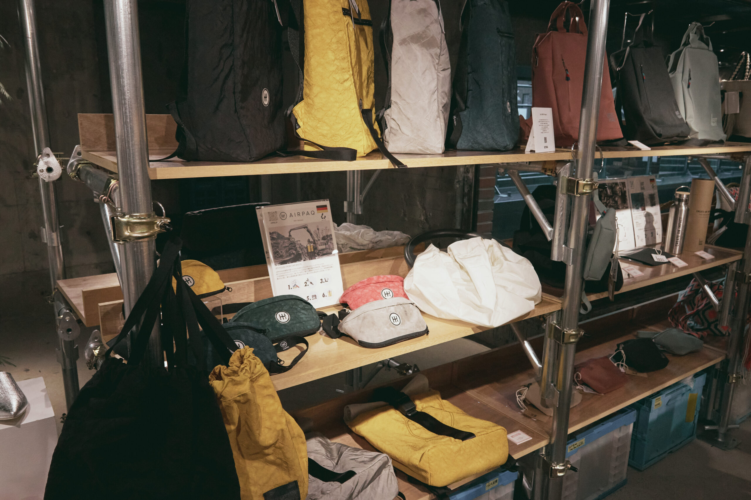 ――AIRPAQは実店舗を持たずにECサイトと、東京と大阪のエシカルコンビニで展開されていますね。本物のエアバッグも一緒に陳列されていて、実際に触ってみるとかなり丈夫な素材であることがより伝わってきました。