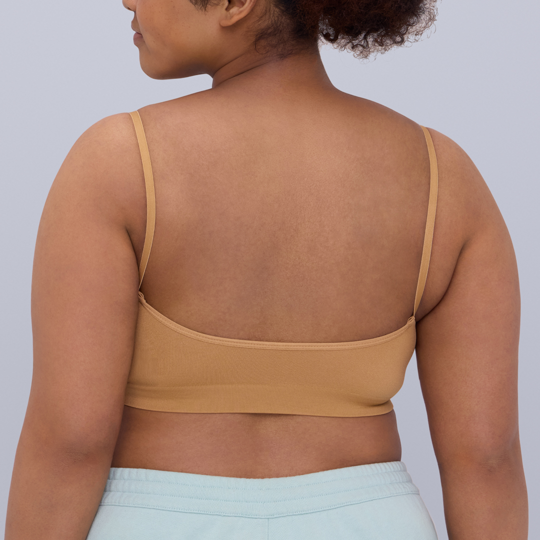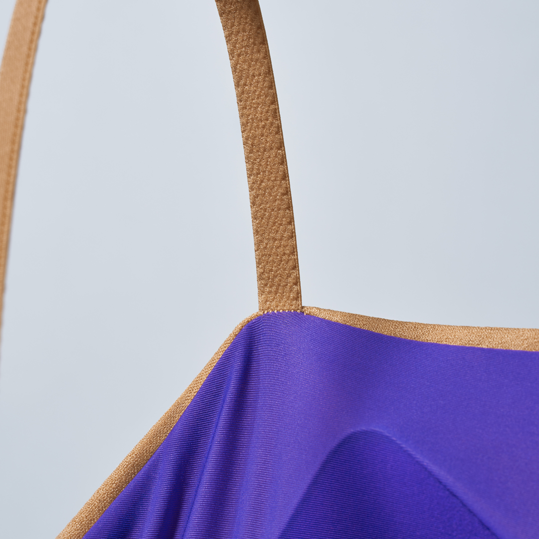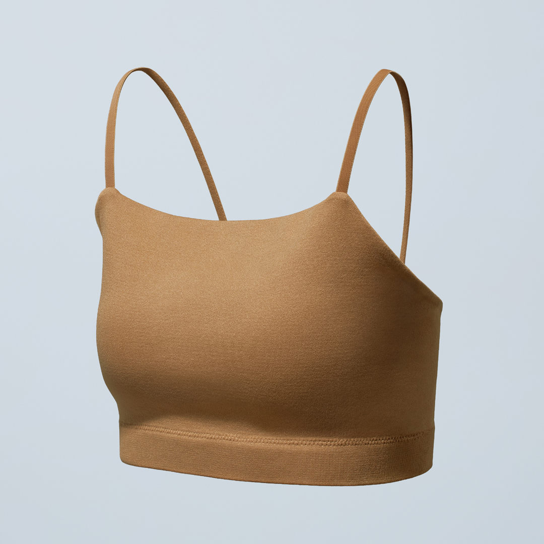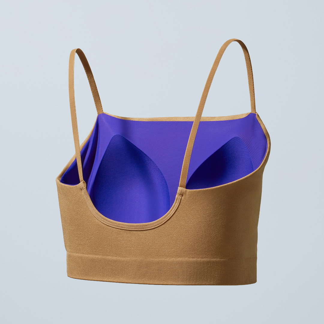 カップ一体型でバスト側の縫い目がないため、驚くほど滑らかな肌あたりが特徴です。これまでに13万枚以上を販売した実績あるアイテムに、新色として「アーモンド」と「バイオレット」が加わりました。表地と裏地の配色にもこだわっており、インナーとしてだけでなく、見せるファッションアイテムとしても活躍します。