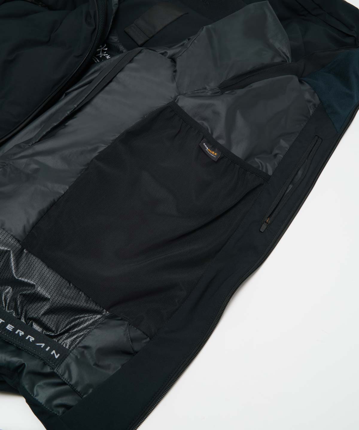 この3本はデザイン要素に留まらず、それぞれがベンチレーション、ハンドウォーマー、ポケットの機能を果たすという、極めてミニマルで合理的なデザインを実現しています。