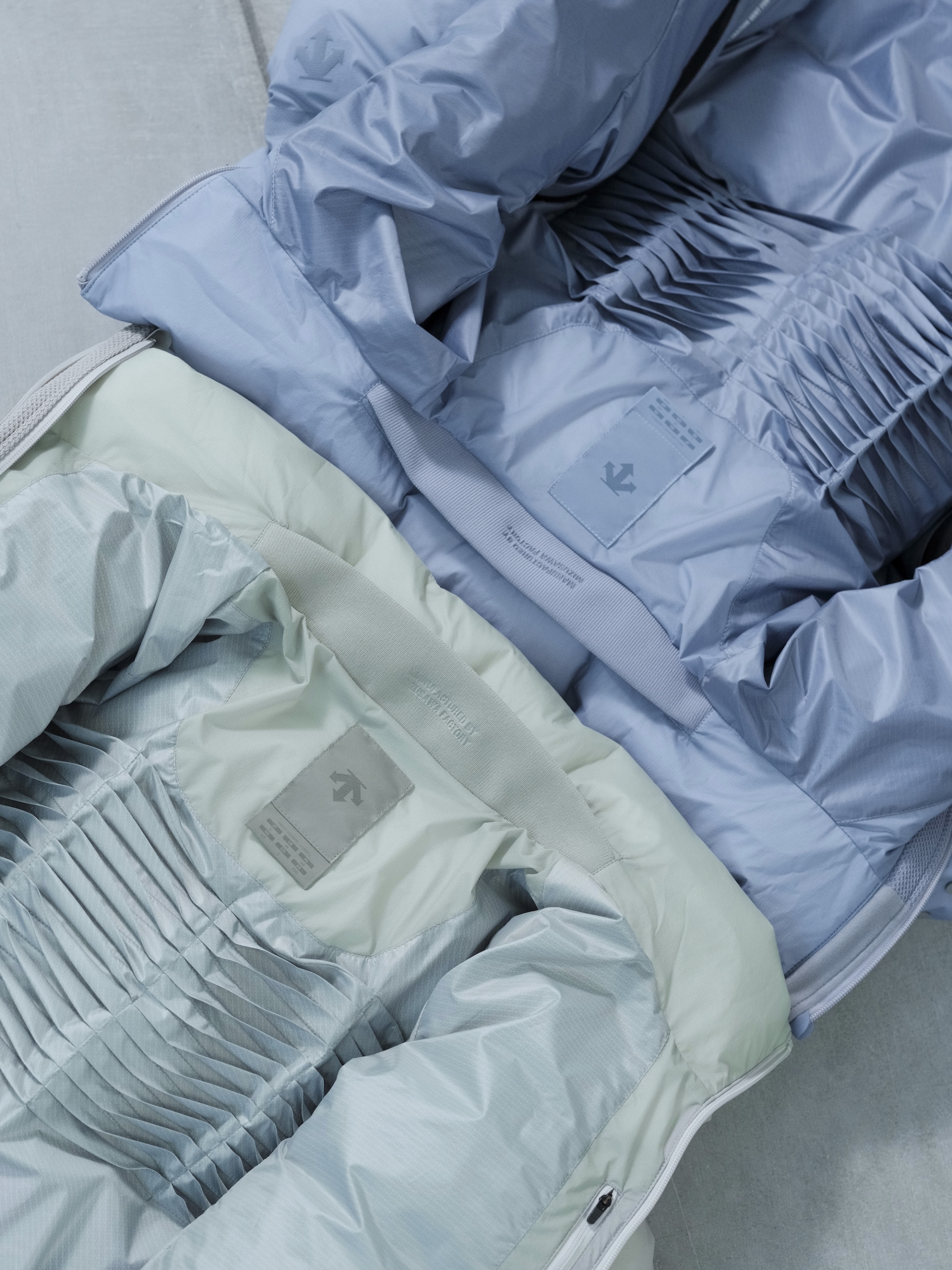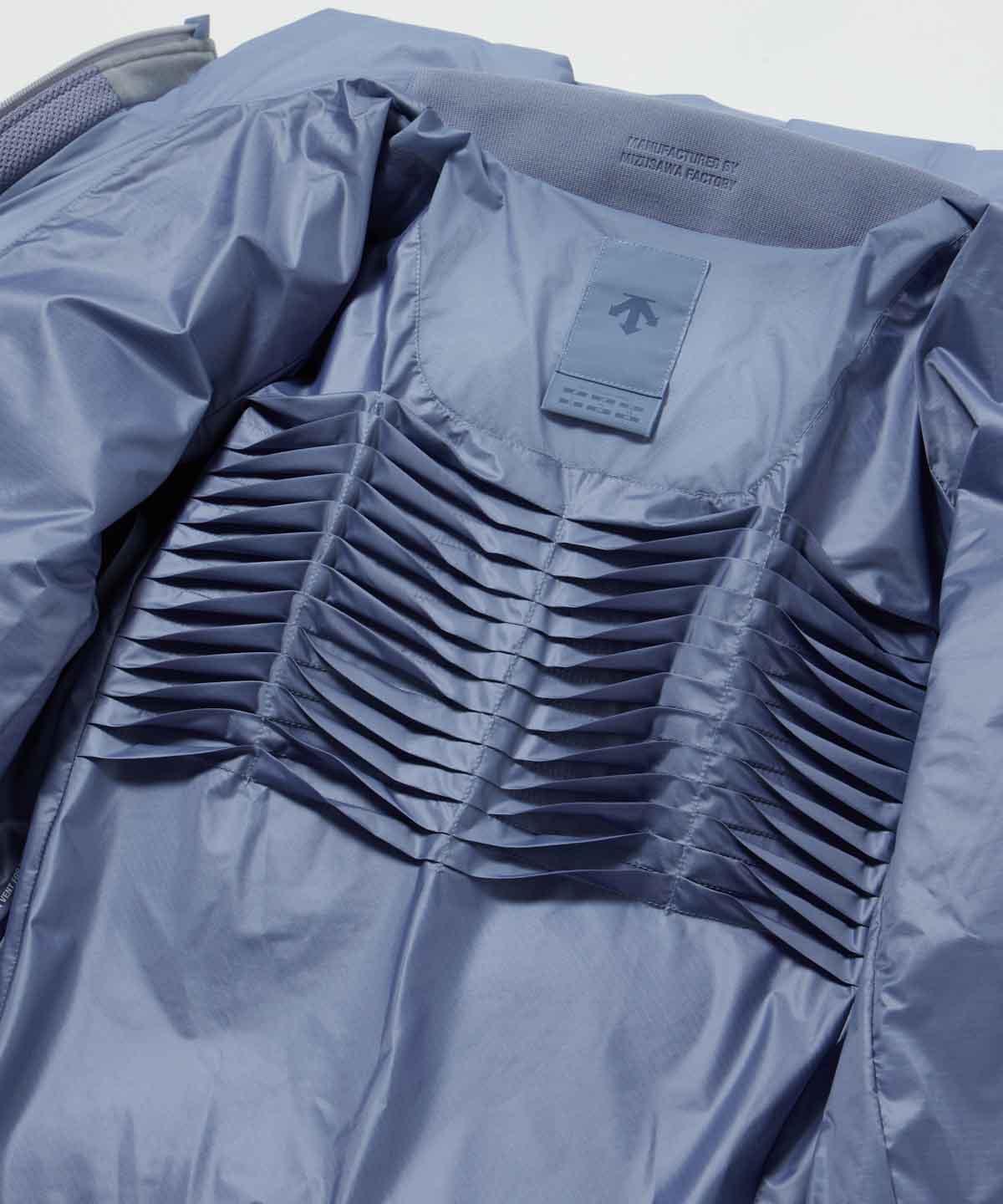 素材は中身のダウンが透けるほど薄い特殊なナイロン素材を採用。カラーは奥州の雄大な自然の息吹を感じられるフィルミーブルー、ペールカーキの2色がラインナップされます。