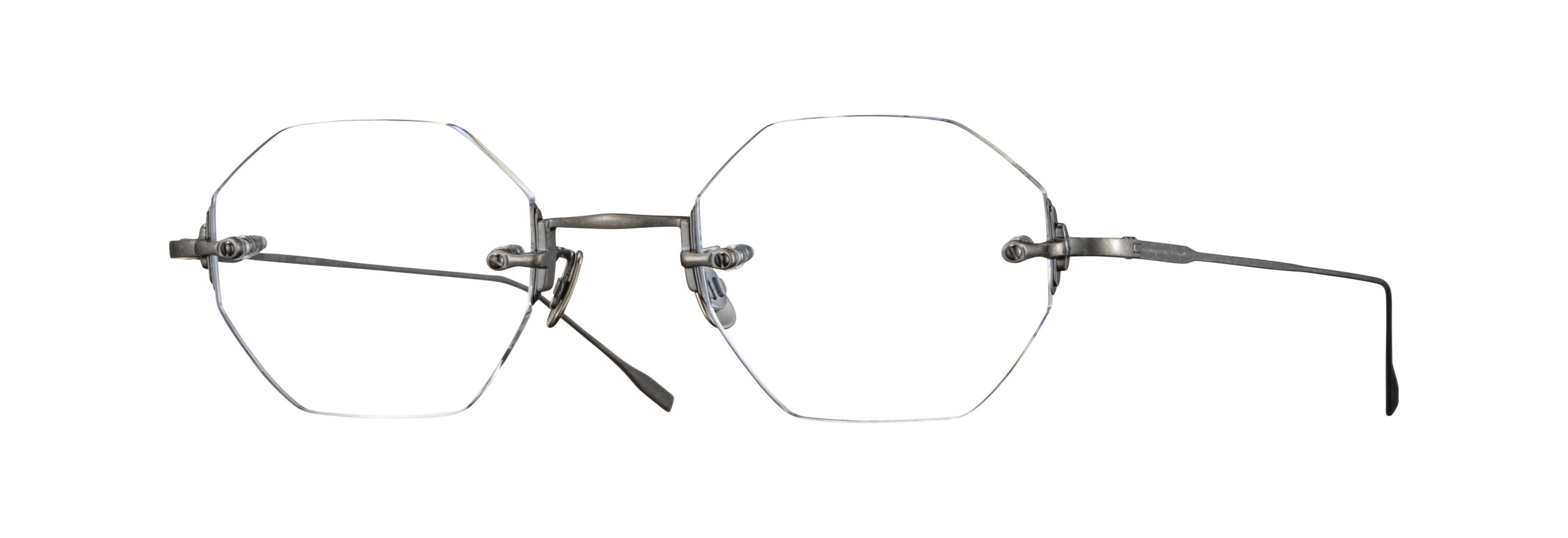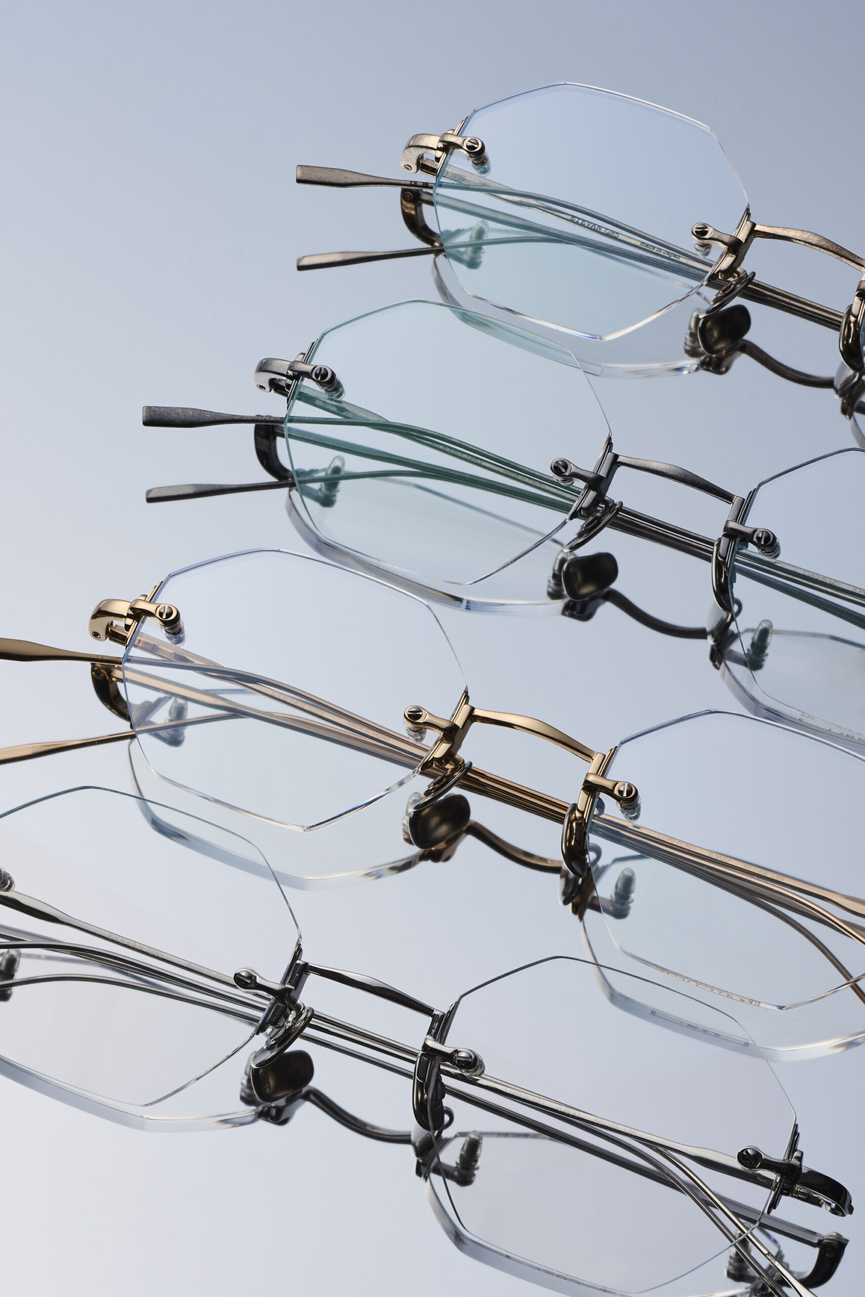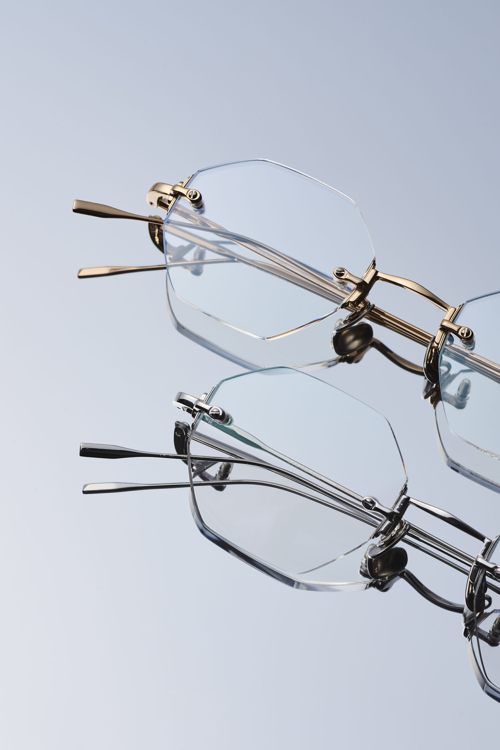 ブリッジやテンプルといった各パーツには、時計のケースやベルトのバックル、文字盤などの意匠が反映されています。エッジの効いたシャープな質感を再現するため、手作業による研磨やメッキ処理に異常なほど入念な時間をかけ、圧倒的な完成度を実現しました。