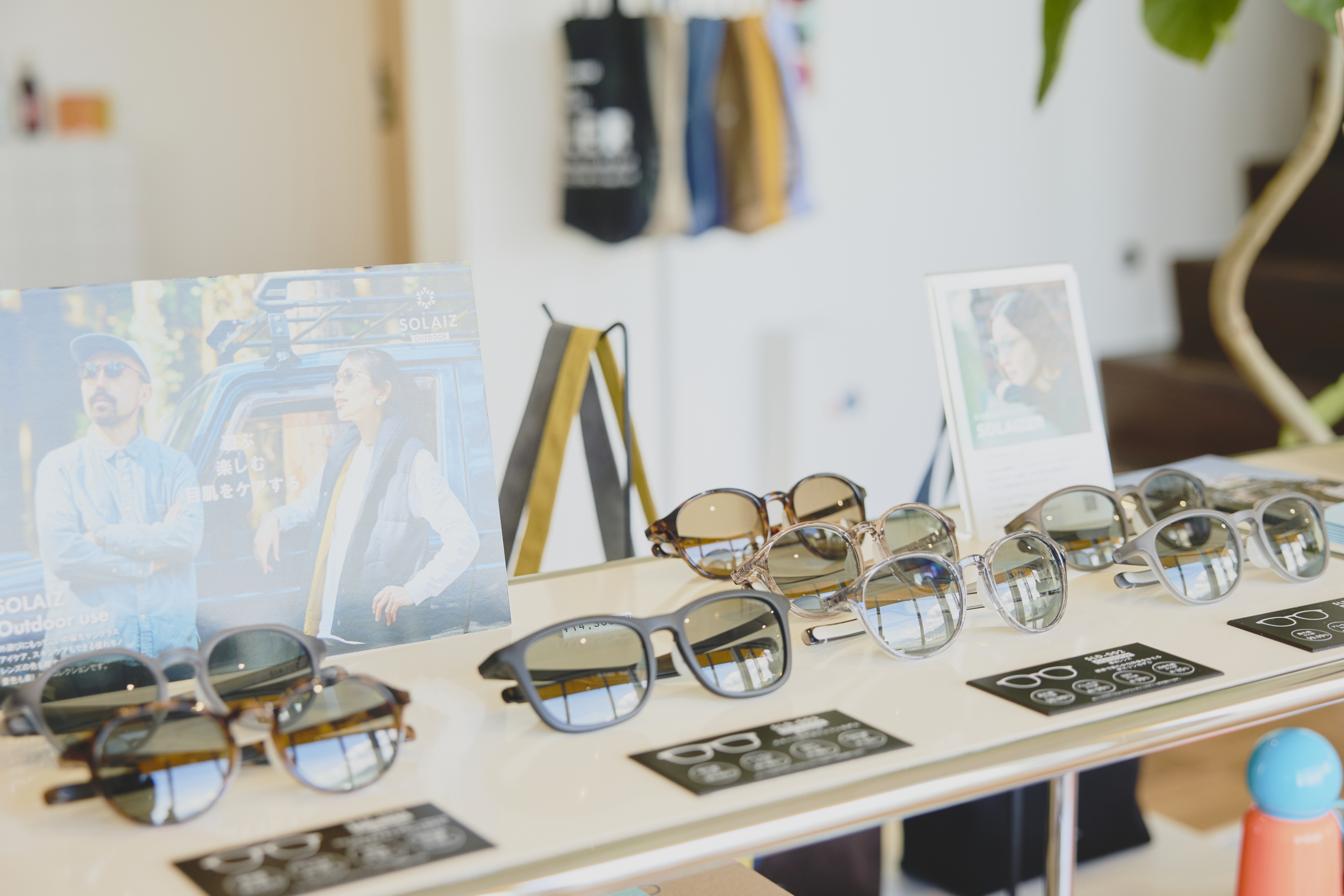 新たに2ブランドの取り扱いを始めました。1つ目は『SOLAIZ(ソライズ)』というサングラスブランドです。こちらは福井・鯖江で医療用メガネを手掛ける『ERICA OPTICAL(エリカオプチカル)』の技術を活かして作られています。耳にかける部分が特徴的で、長時間着用してもずれにくく頭が痛くならない、非常に快適な付け心地です。フレームやレンズもすべて自社製作なので修理も可能で、長く使い続けられます。