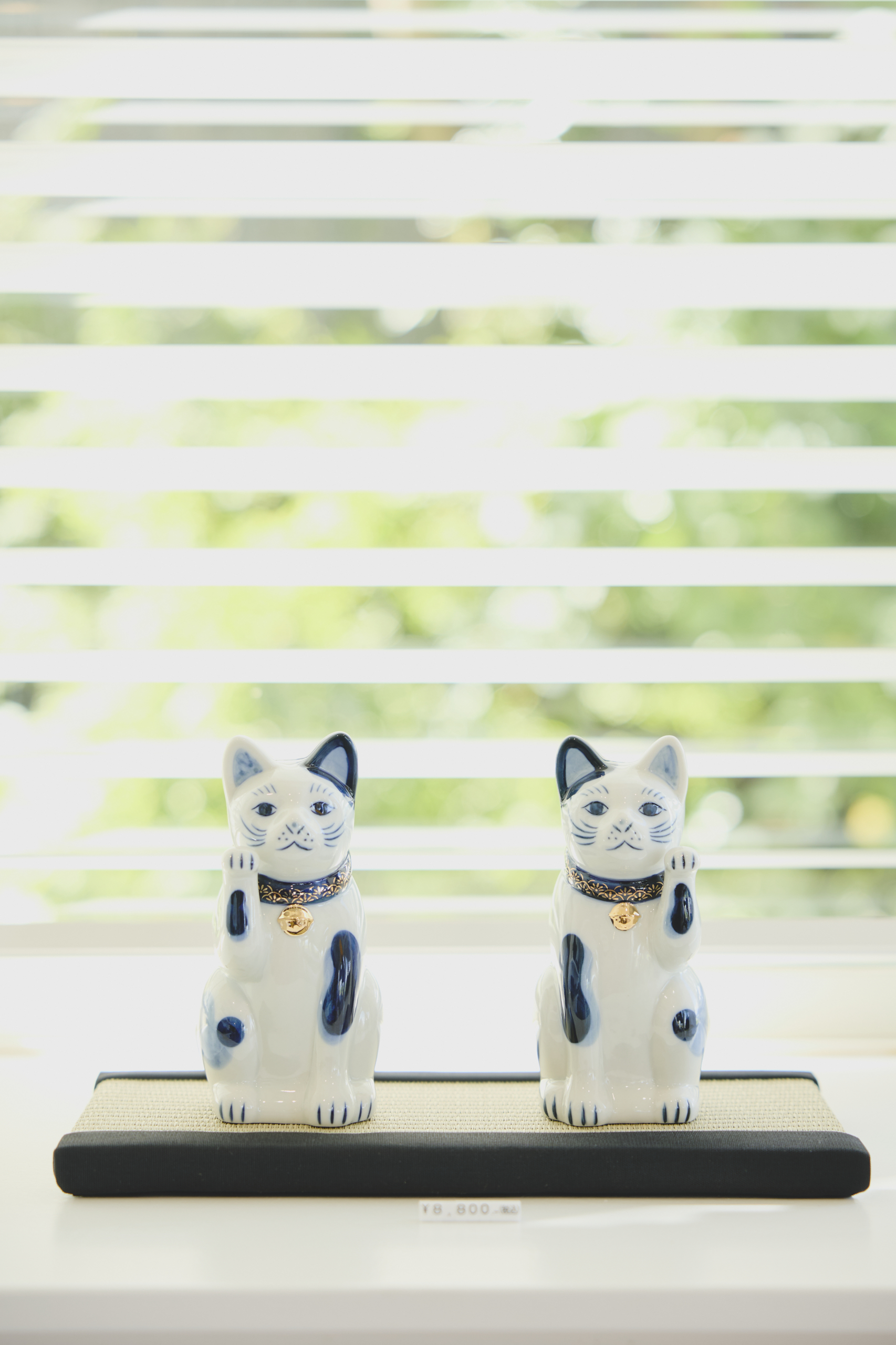 店頭では招き猫を中心に販売しています。可愛らしいモチーフですが、実は左手と右手で込められた意味が異なり、両方の側面を併せ持つユニークな招き猫も扱っています。