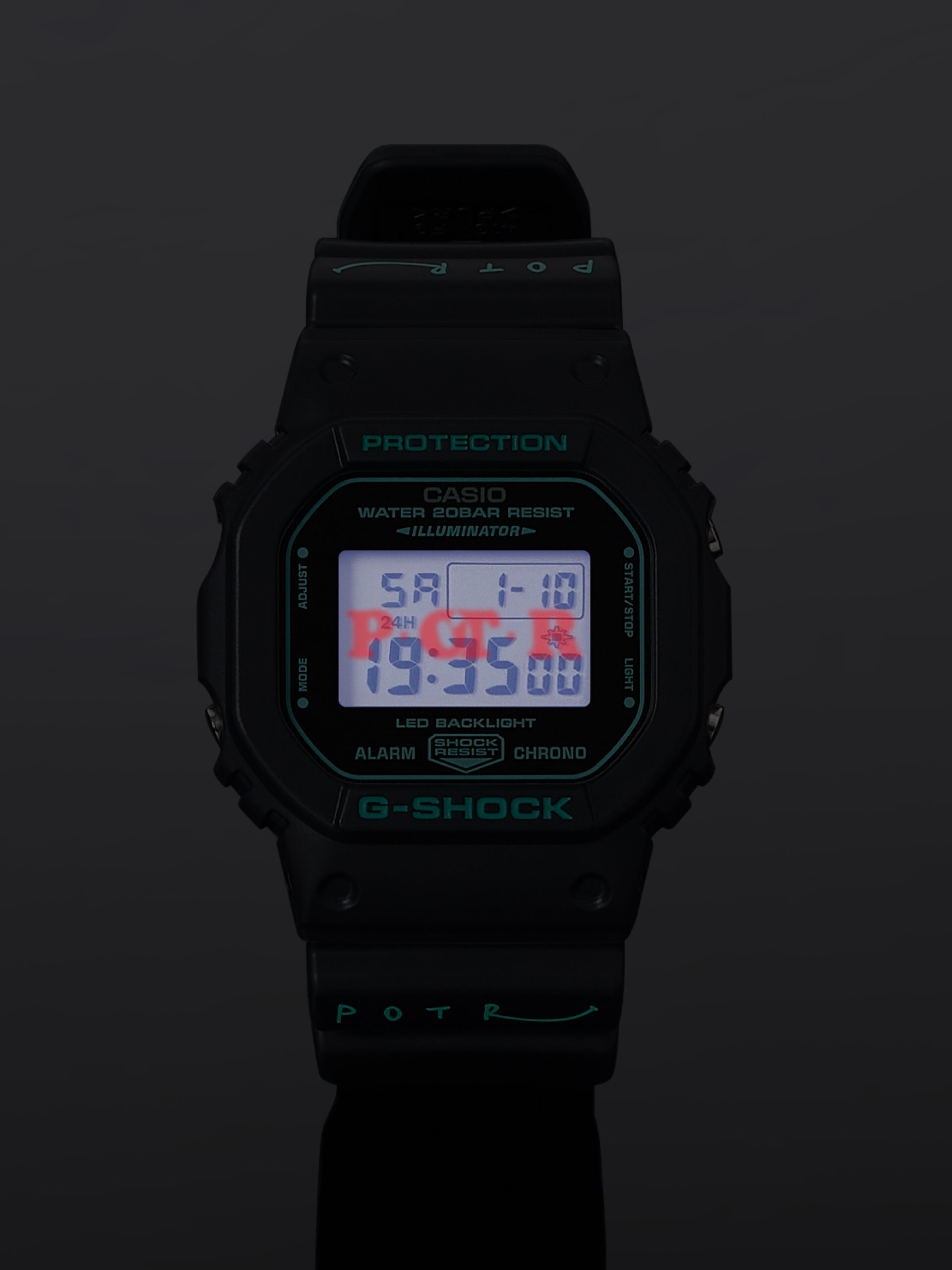 ベースモデルには、初代のDNAを色濃く継承する「DW-5600UE-1JF」を採用。アイコニックなオクタゴンベゼルとスクエアディスプレイを、POTRを象徴する鮮やかな「ターコイズブルー」が彩ります。 バックライトを点灯させるとPOTRのロゴが浮かび上がり、裏蓋にはPOTRスマイリーの刻印が施されるなど、所有欲をくすぐる遊び心溢れる仕掛けが満載です。