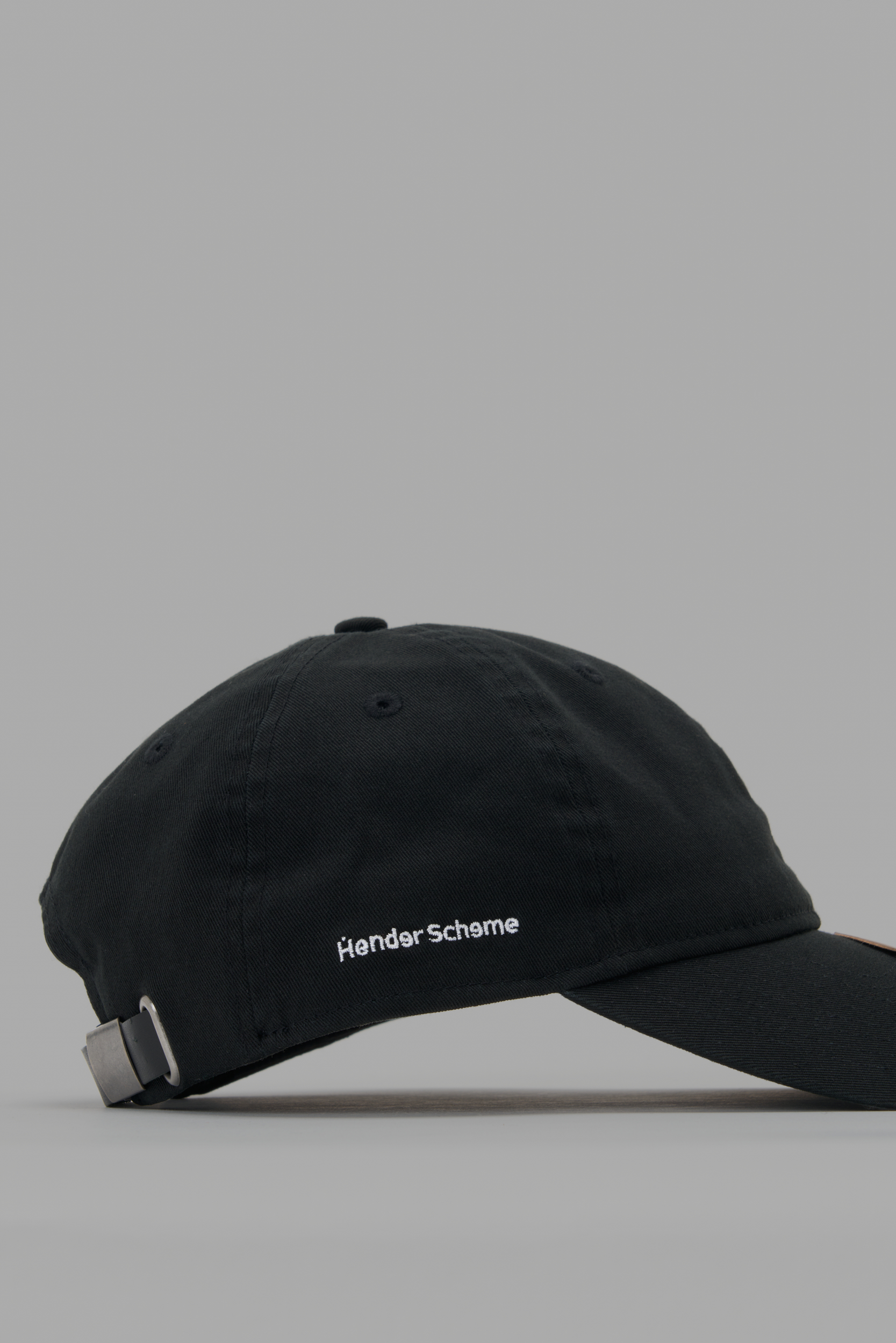本作最大の特徴は、本来シールであるバイザーステッカーをHender Schemeを象徴するベジタブルタンニンレザーで製作した点にある。レザーの厚みに刻印を施すことで、奥行きのある表情が生まれ、シンプルな構成の中でさりげない存在感を放つ。このディテールを際立たせるため、フロントはあえて無地とし、Hender Schemeのロゴ要素は右サイドとリアストラップに集約。静謐ながらも強い意図を感じさせるデザインだ。