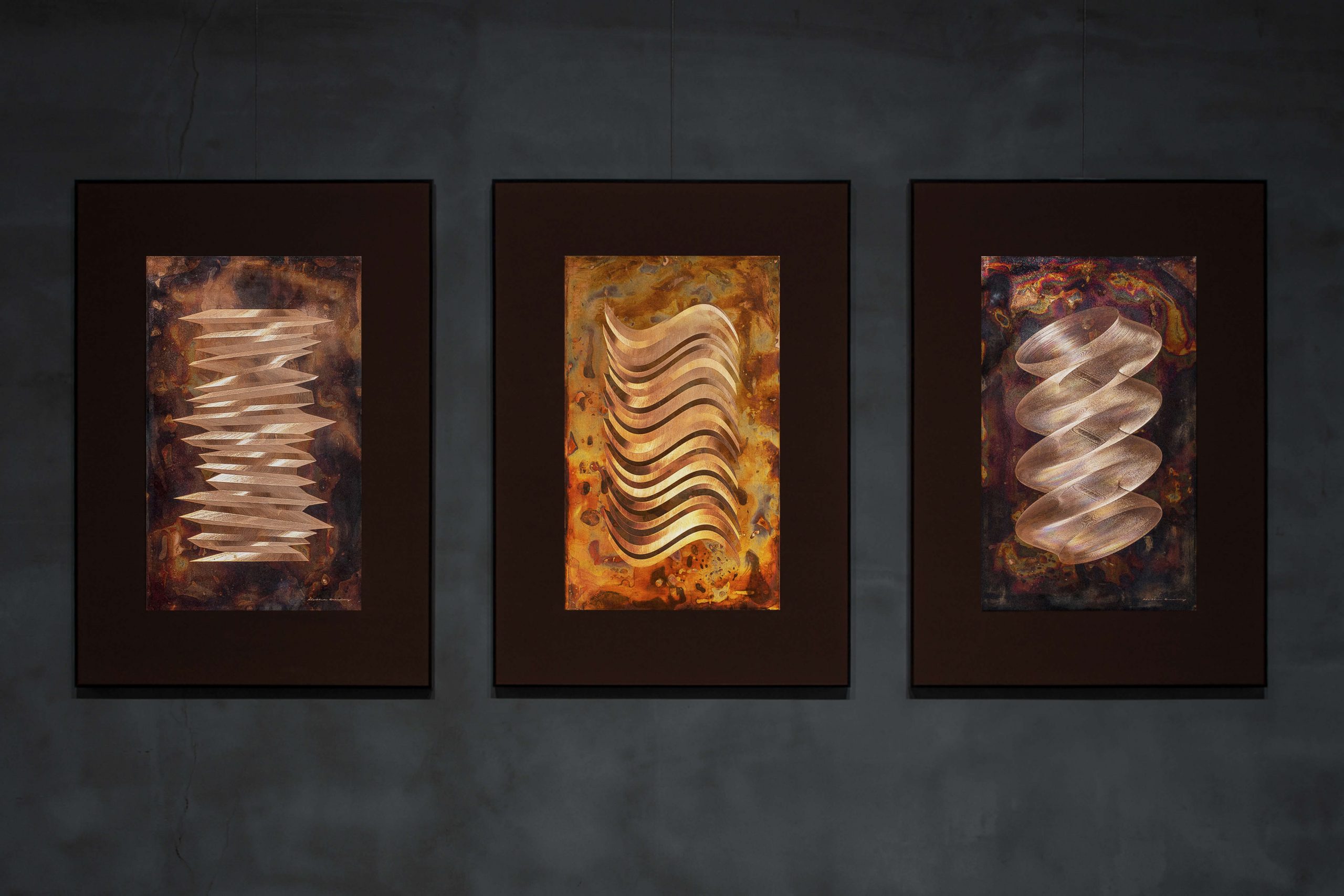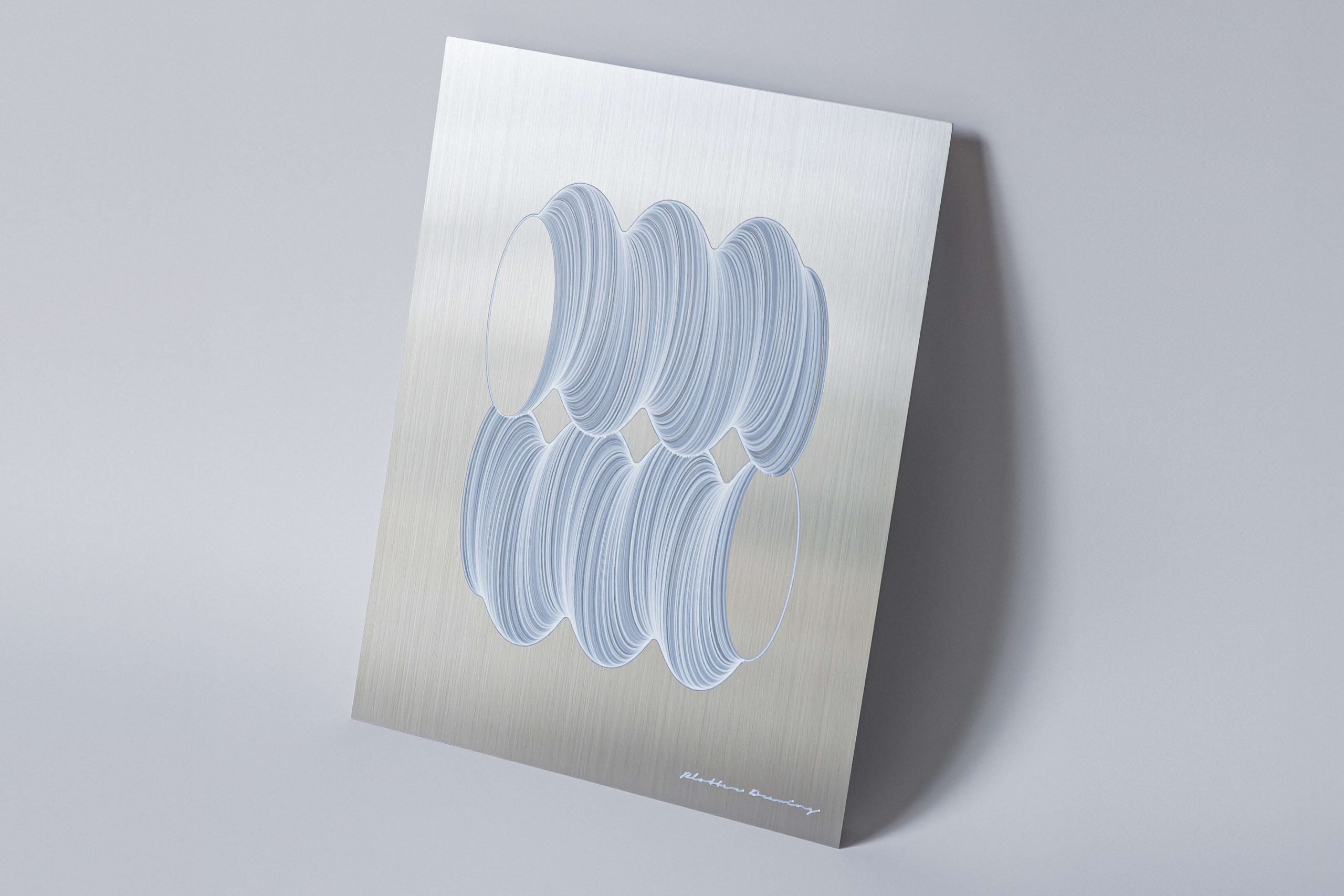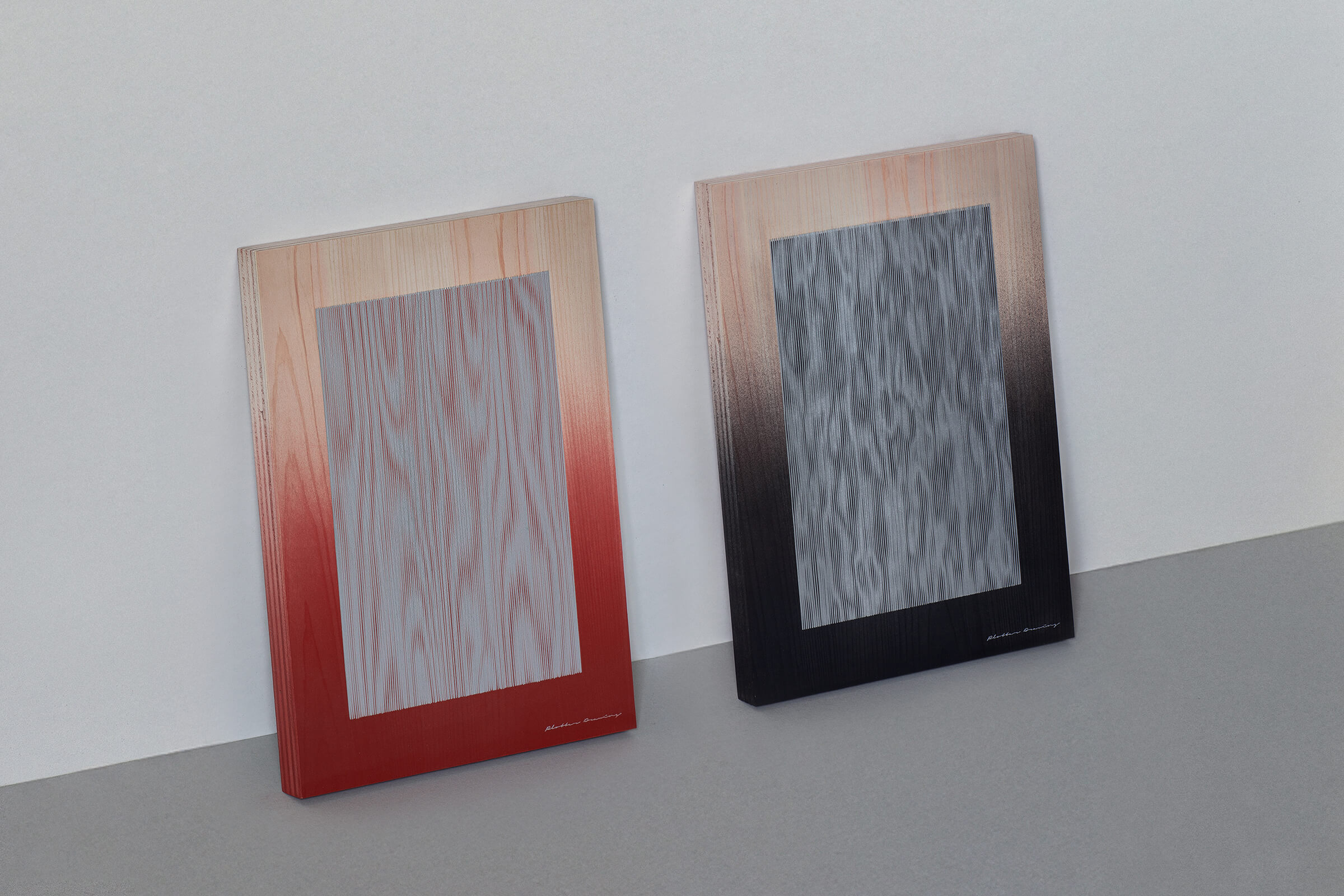 新作の「OnWood」シリーズは、グラデーション染めを施したヒノキの板に、プログラミングを用いた木目のグラフィックを描いた作品。自然が生み出した木目と、人の手によって作られた木目の重なりは、デジタルとリアルの境界を曖昧にし、有機と人工が共鳴する風景を生み出します。さらに、本展では「SPUR」シリーズや「Poly & Arc」シリーズなど、絵筆や鉛筆、ボールペンなどの様々な筆材で描かれた作品も一堂に会し、プロッタードローイングの広がりと奥深さをご覧いただけます。