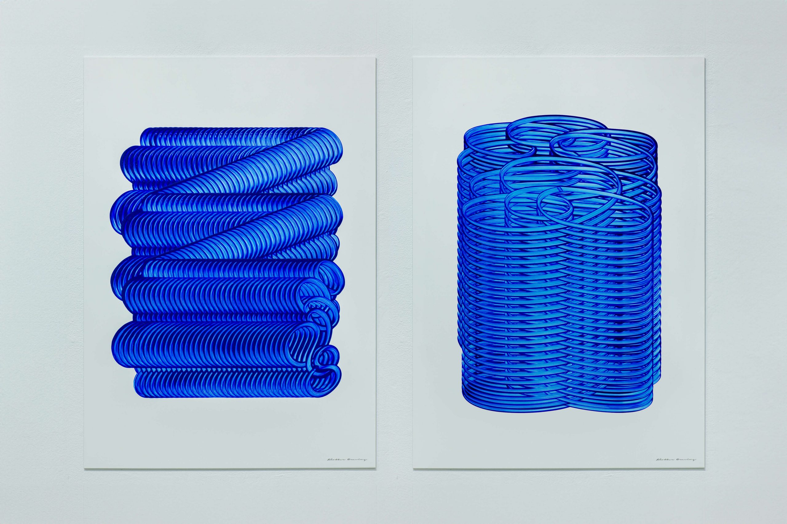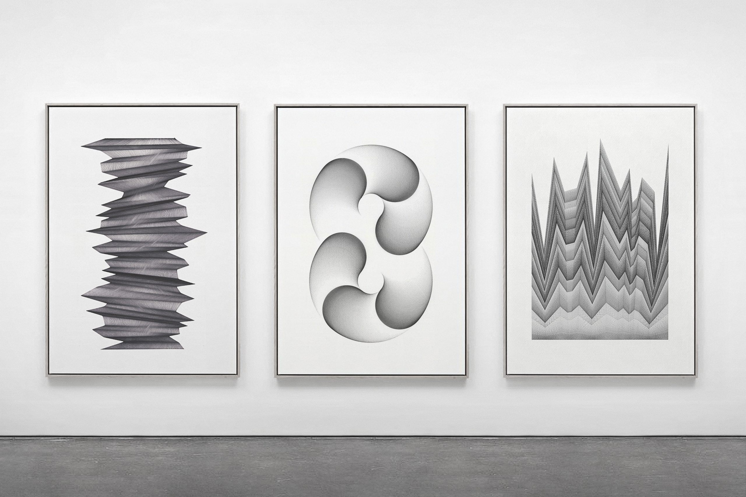 本展は、プロッターを用いてデジタルとリアルの間に生まれる偶発的表現をつくり出す手法「Plotter Drawing(プロッタードローイング)」を、10年間にわたり探求してきた深地氏の節目の展示です。新作と旧作を織り交ぜ、これまでの軌跡を辿る構成となっています。