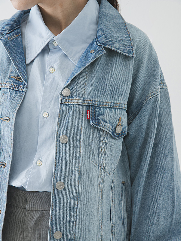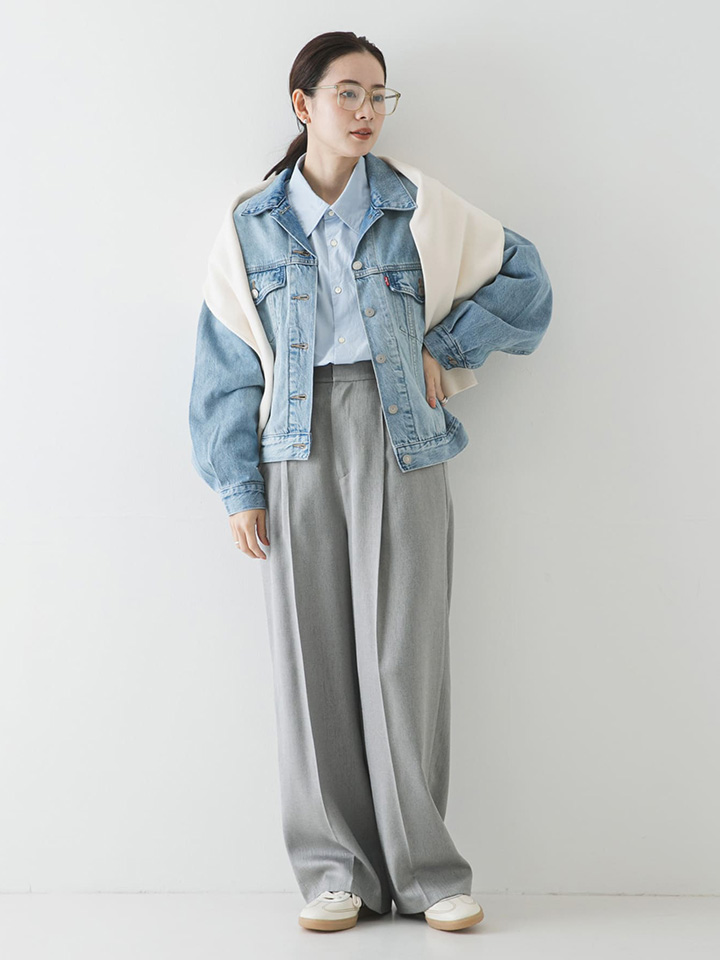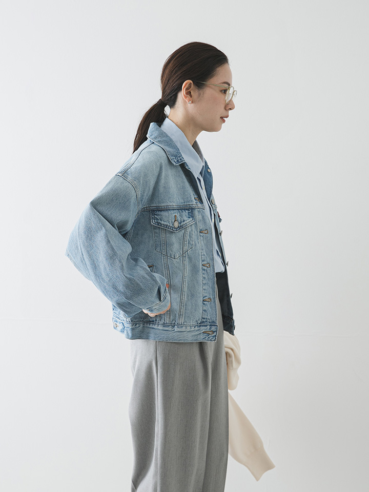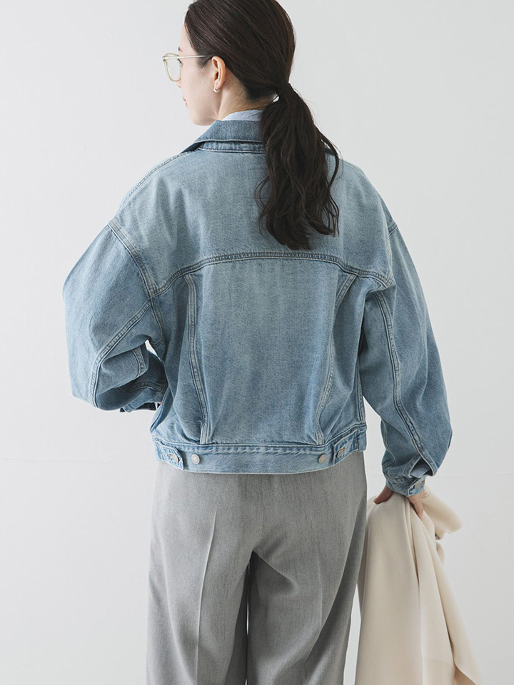 素材には、通年での着用に最適なミッドオンスの綿100%デニムを使用。着込むほどに身体に馴染み、自分だけの一着へと変化していく過程を楽しめるのは、本物志向のデニムならではの醍醐味です。 展開カラー「SHE KNEW」は、春先のホワイトパンツやチノパンツ、あるいは軽やかなワンピースとも相性抜群。どんなスタイルも上品に格上げしてくれる万能なカラーリングです。