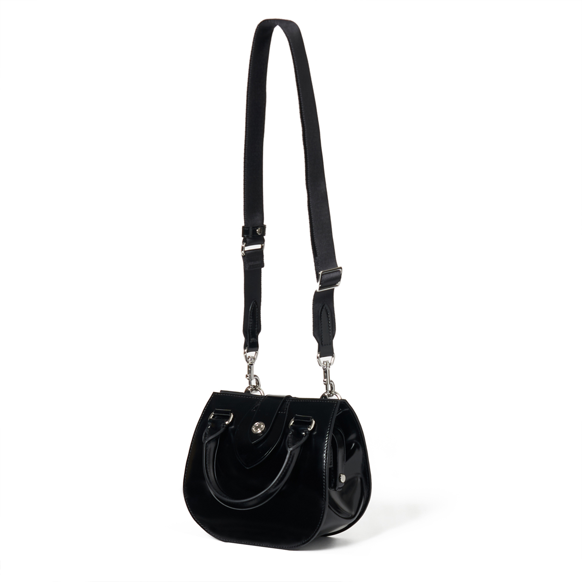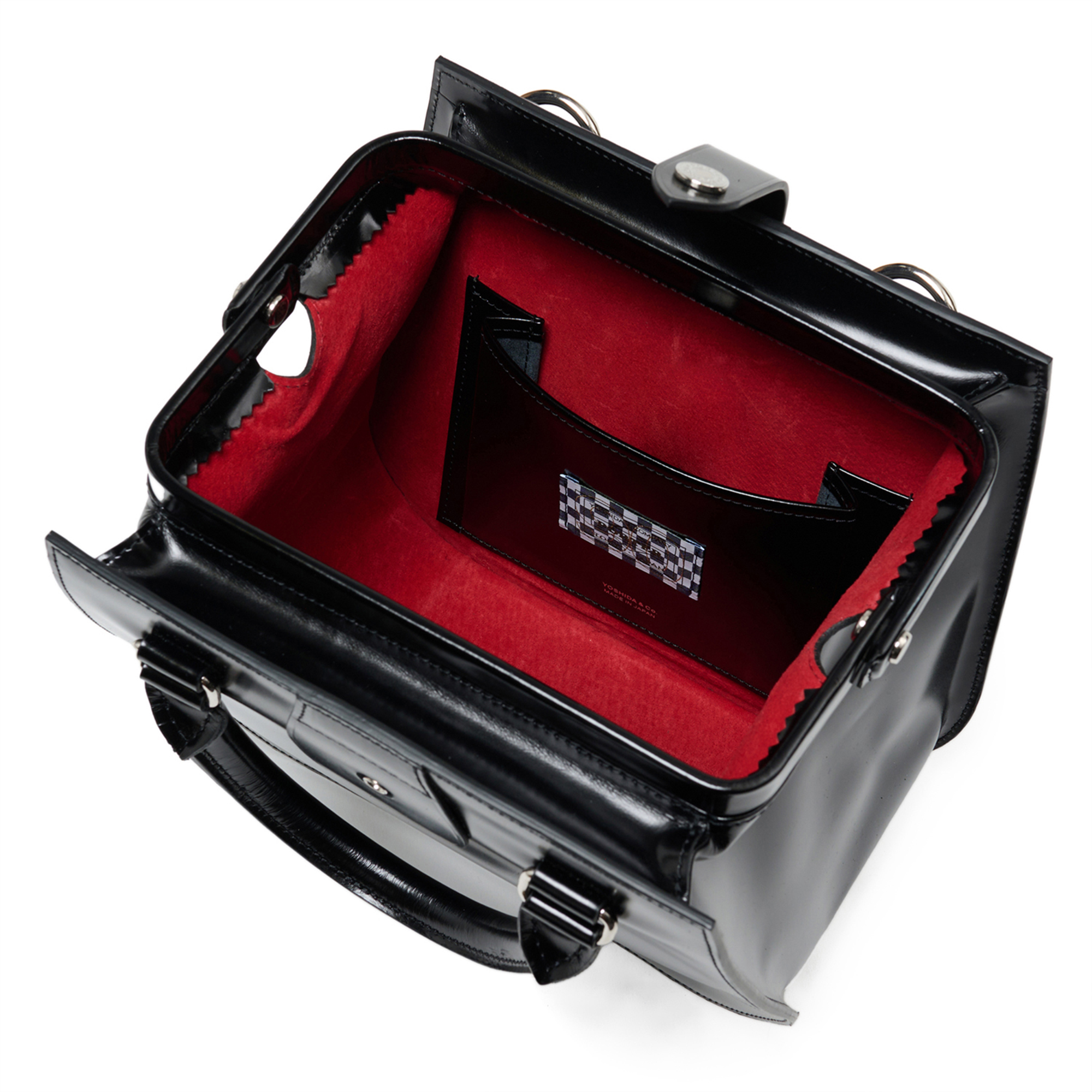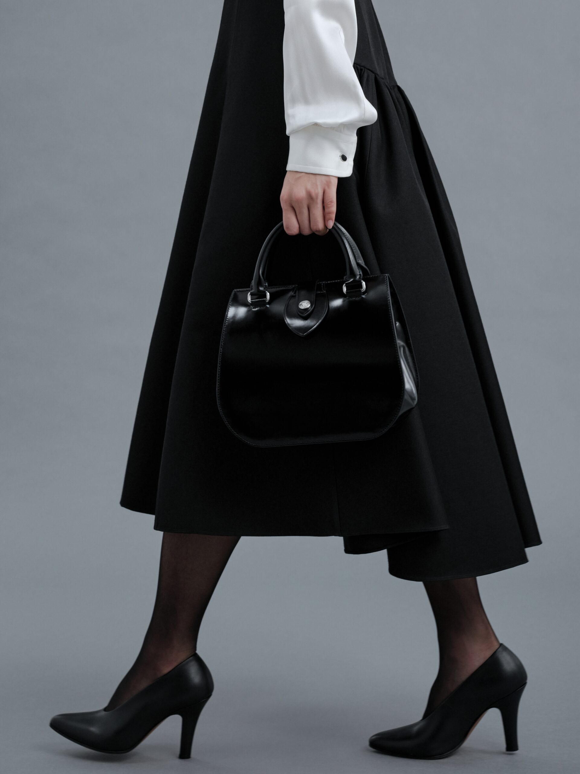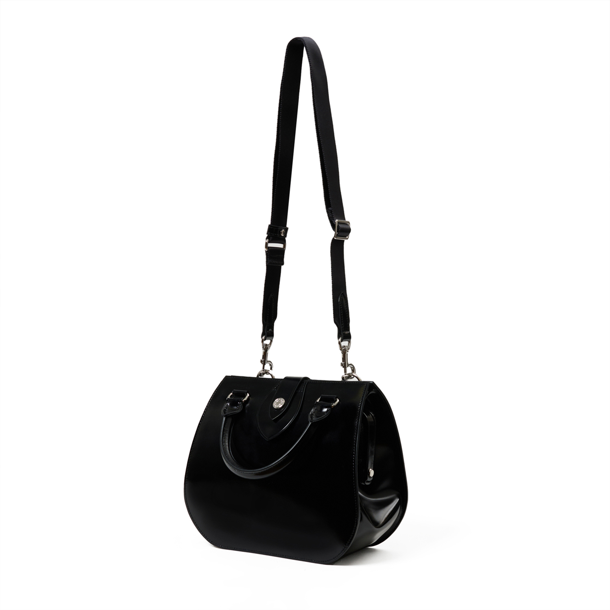 バッグの顔となるのは、グランドピアノを彷彿とさせる深く艶やかな黒のガラスレザー。
