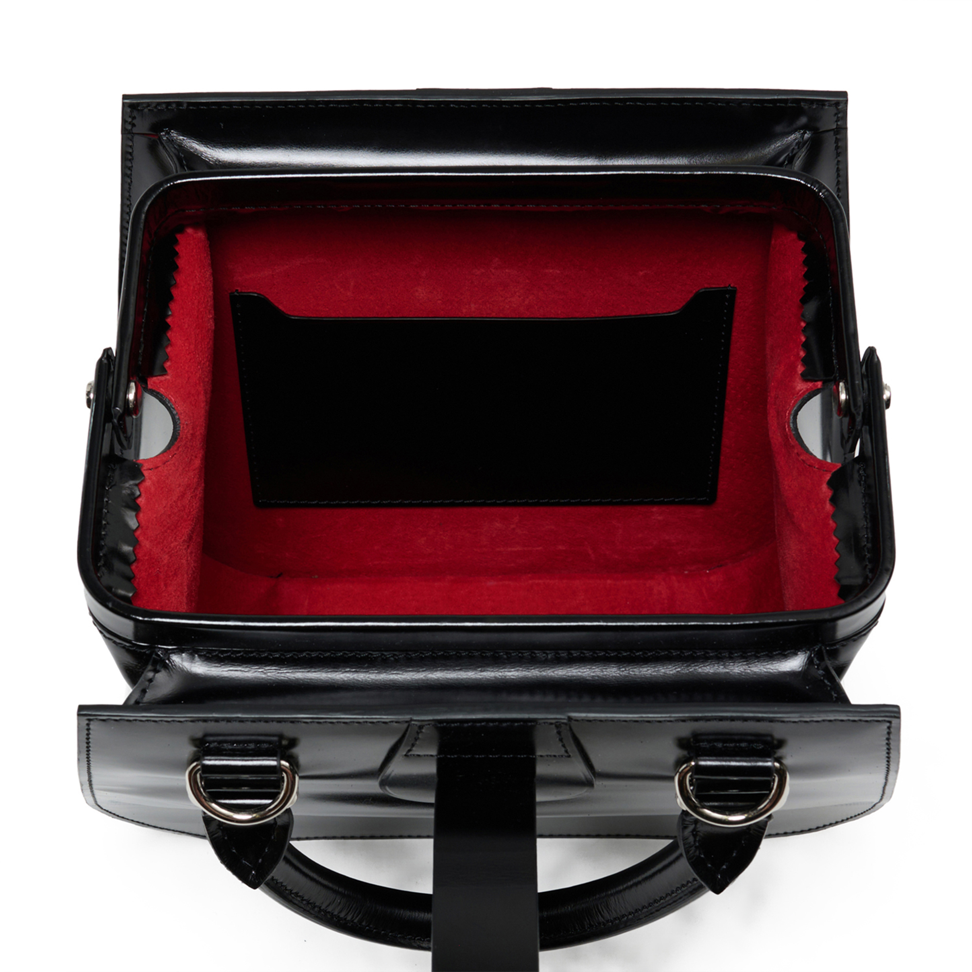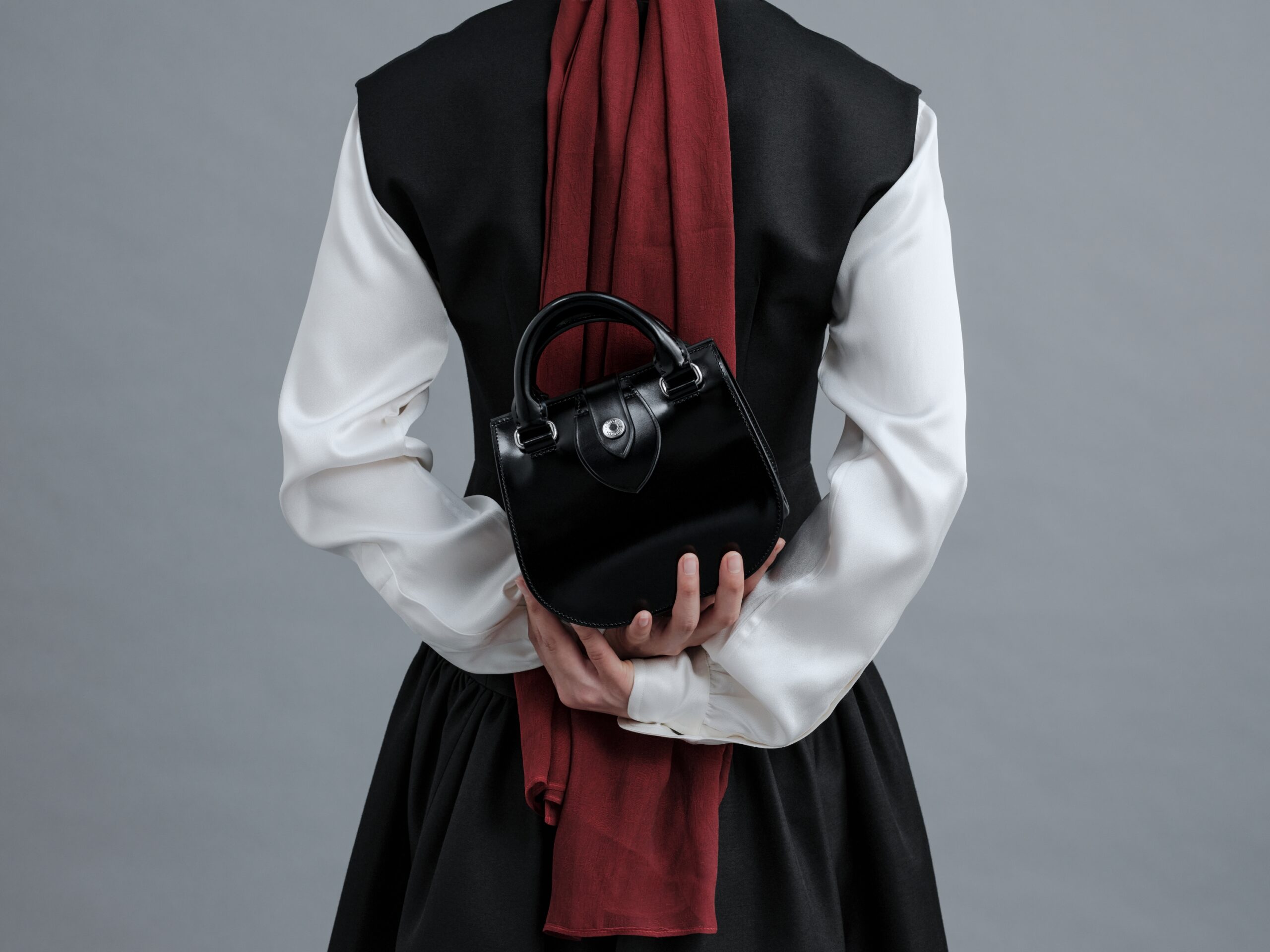 その堅牢な佇まいを開けると、内装にはなめらかなピッグスエードの「赤」が広がります。これは、当時のバスガールのトレードマークだった制服の襟やスカーフへのオマージュ。靴紐を締めるように、間口をきちんとしめる構造は、使う人の所作までも美しく、エレガントに整えてくれます。