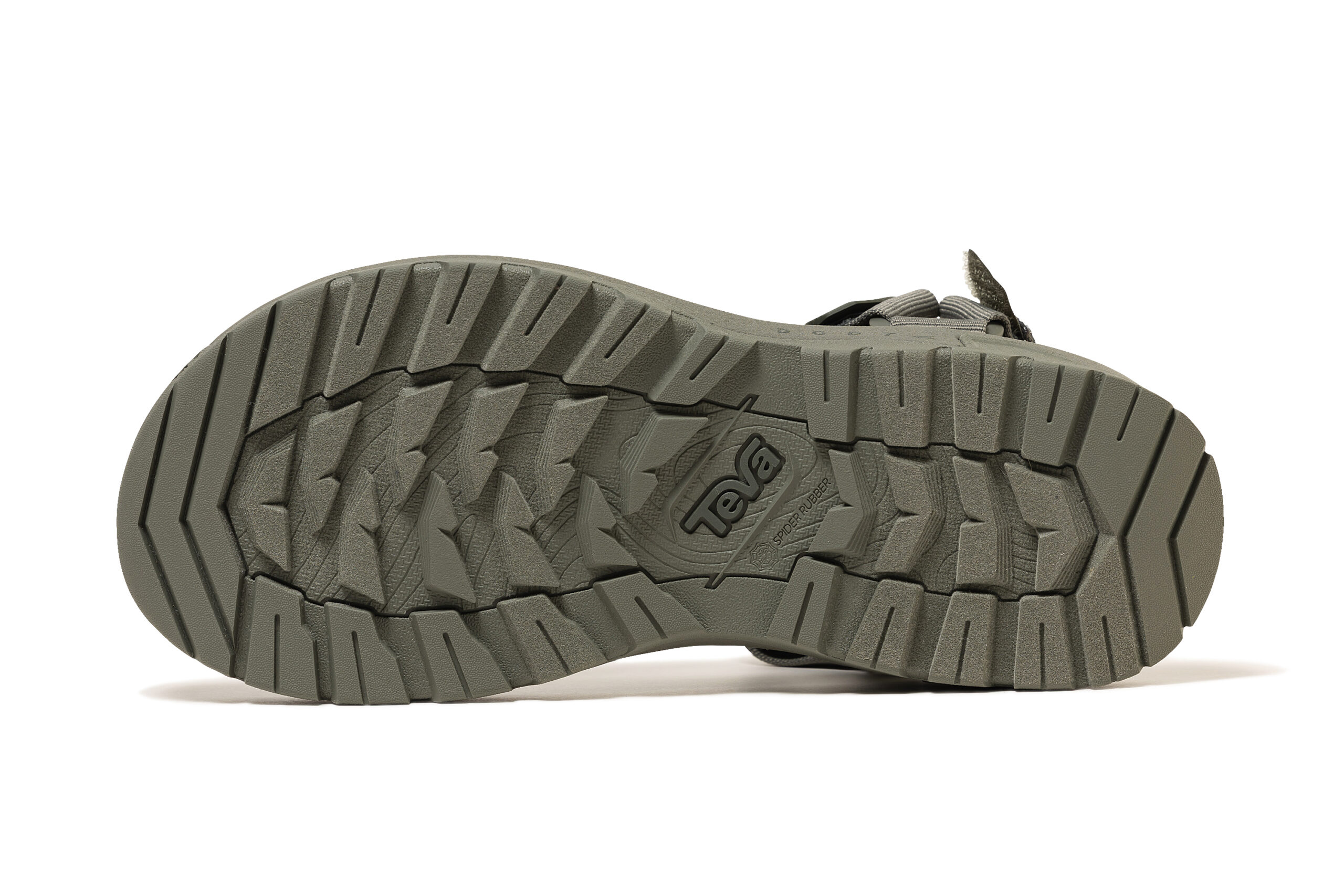 踵のストラップ部分には、DESCENDANTの象徴である「HORIZON」ラベルを配置。ソールのサイドには「DCDT+CETUS」のグラフィックをあえて同系色でプリントし、さりげない主張を込めた。また、ストラップの裏側にはTevaのスローガン「FOR PLAYGROUND EARTH」を配するなど、見えない部分にまで両者のフィロソフィーが刻まれている。