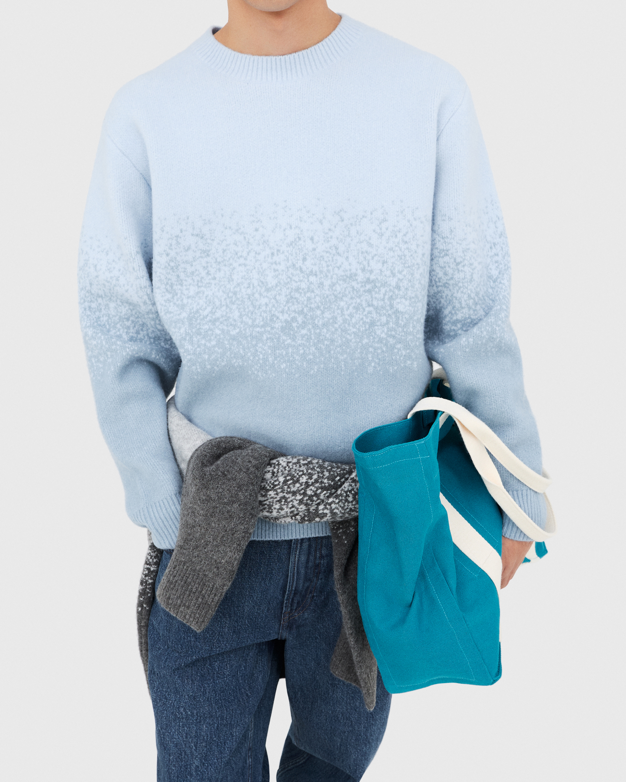バイカラーヘリンボーン柄ラムクルーネックセーター: 伝統的なヘリンボーン柄をバイカラーで表現。上質なラムウールを使用し、ジェンダーレスに楽しめるデザインに仕上げられています。