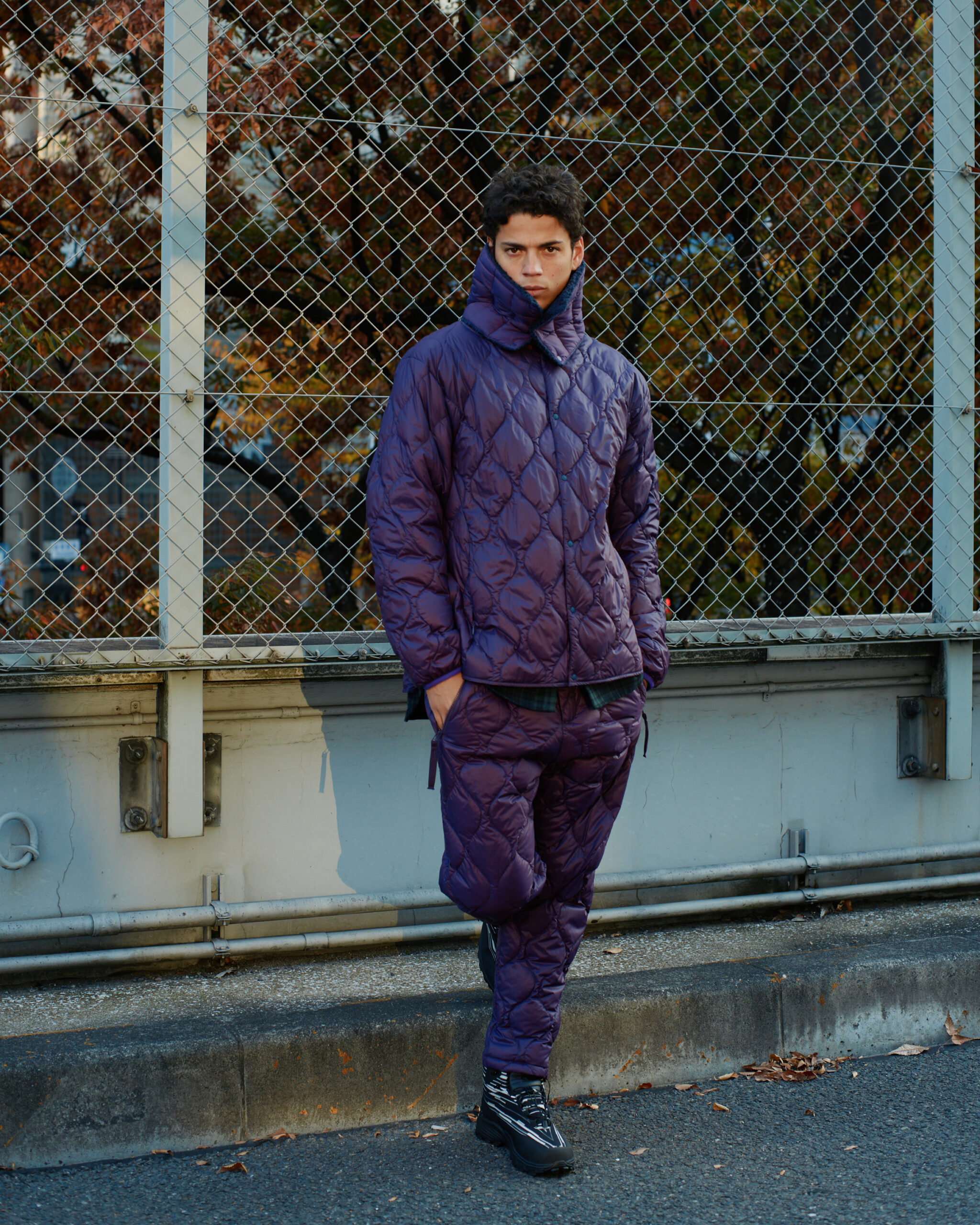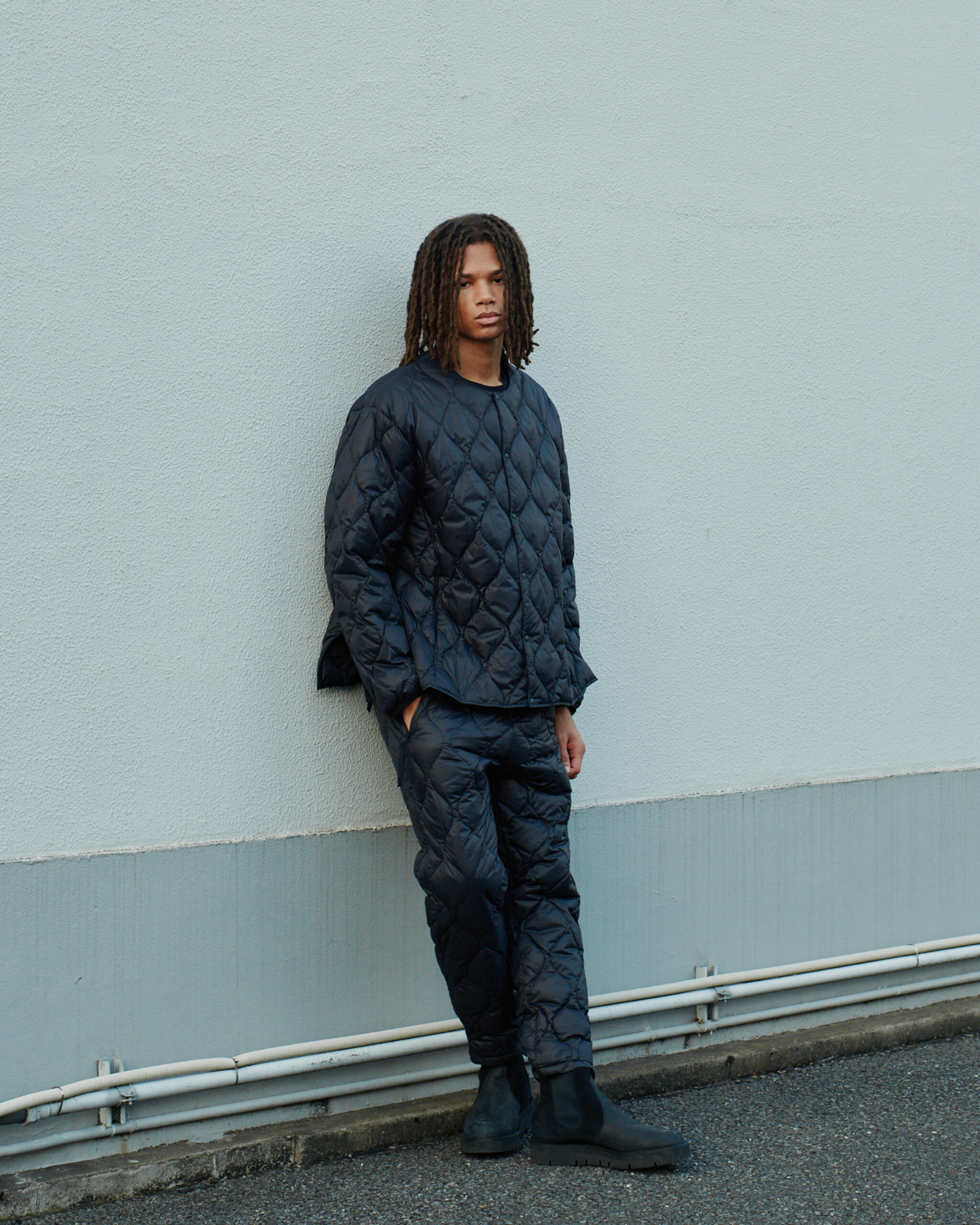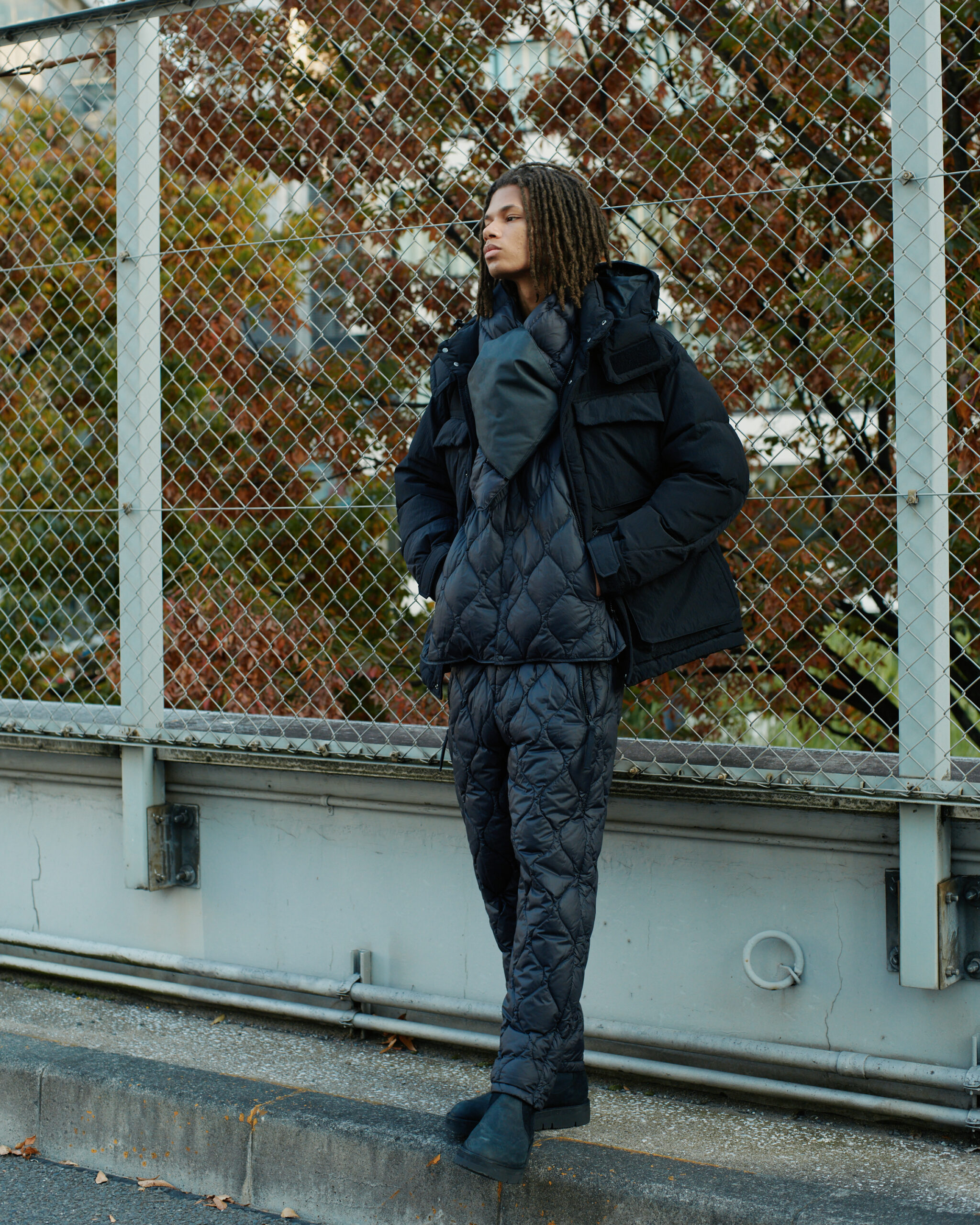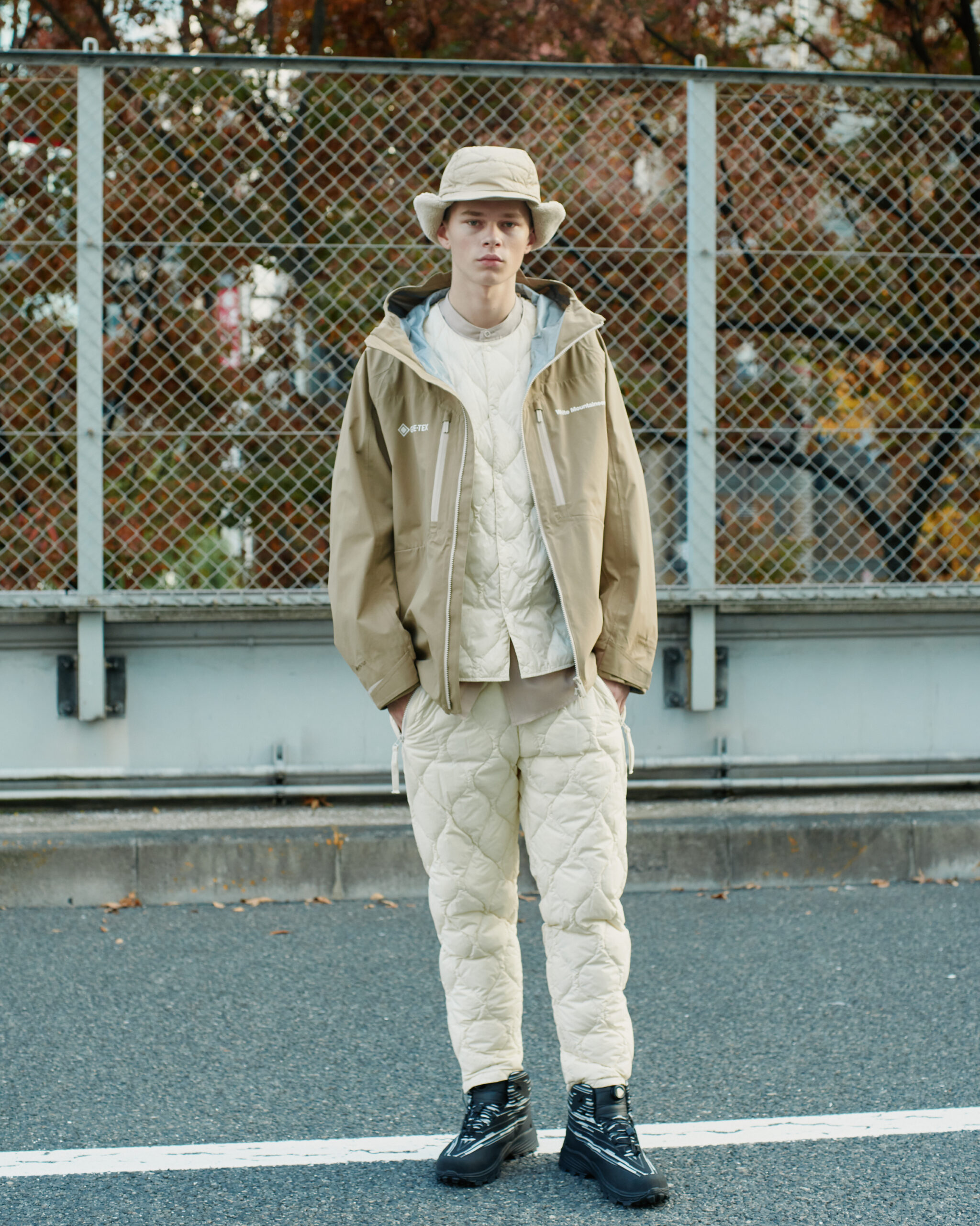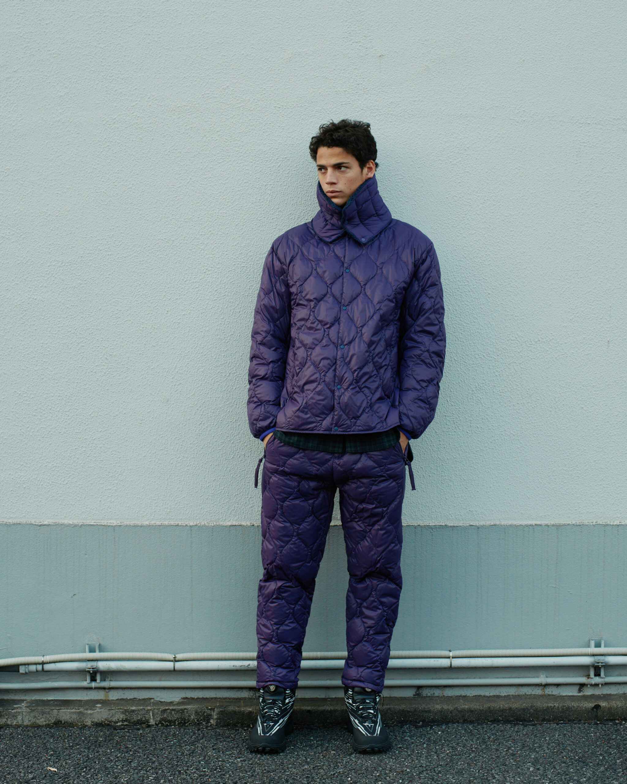 White Mountaineering独自のパターン設計により、ラインナップされたライトダウンジャケットとライトダウンパンツは、単なる保温着に留まりません。